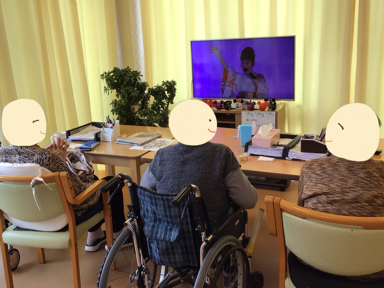 歌謡ショーの様子は、ユニット内のテレビに生中継し、ご利用者様も見て、聴いて楽しみました。