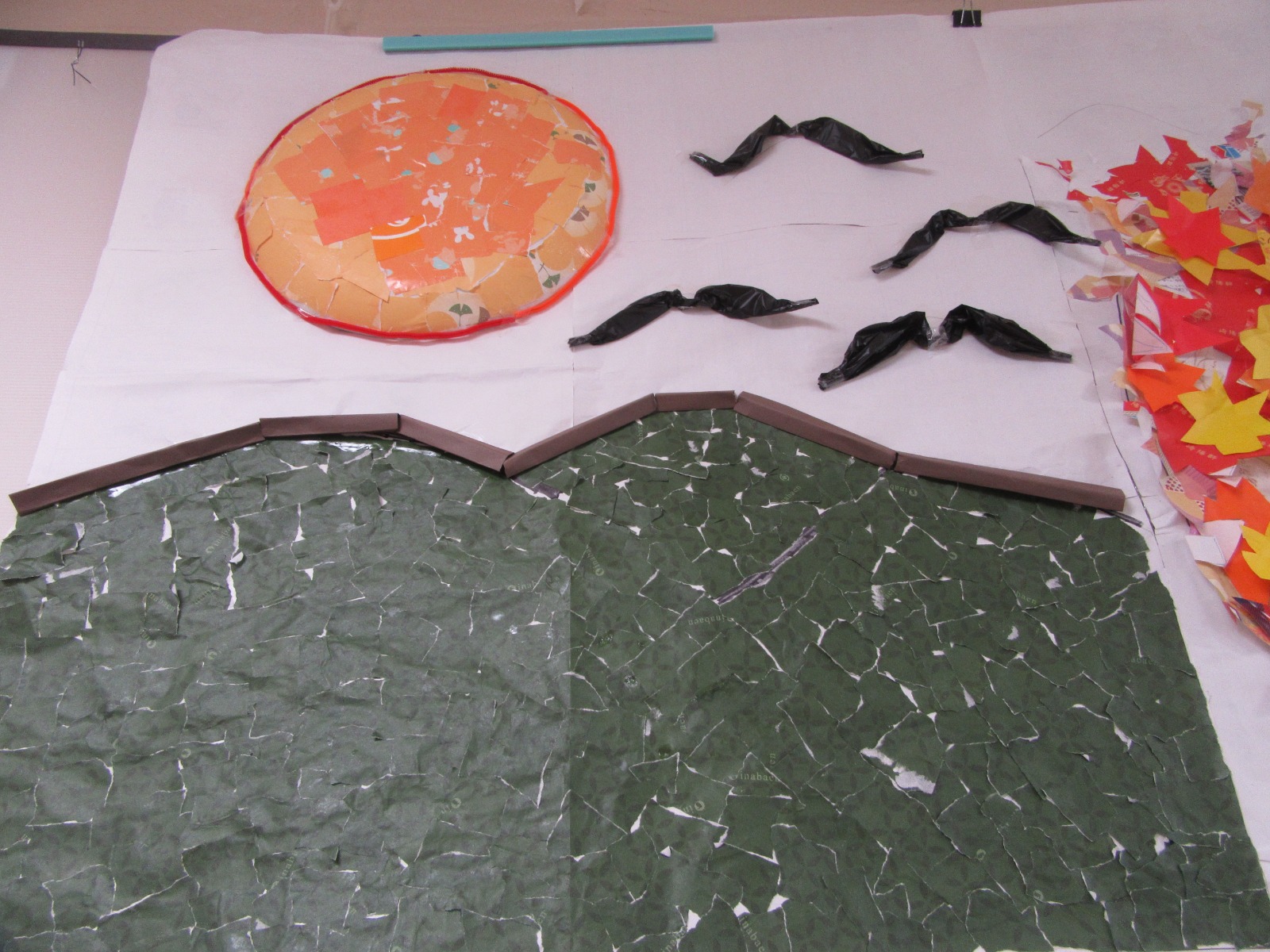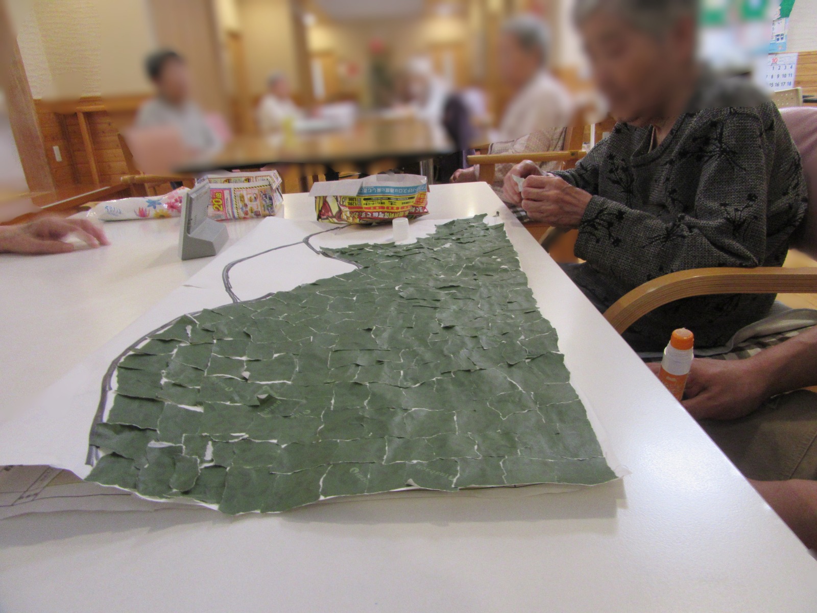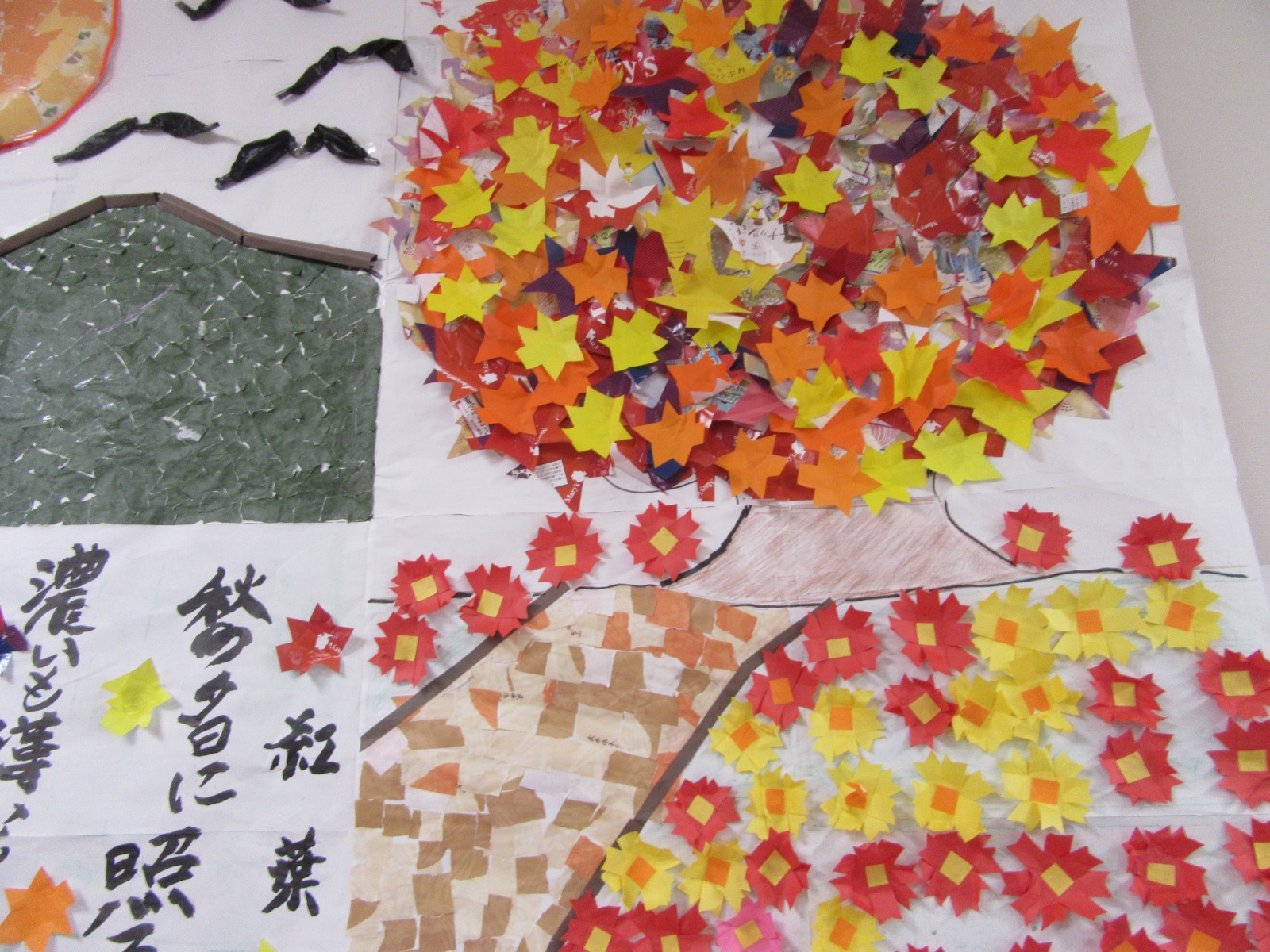 沢山の紅葉を型取りする方、切る方、貼り付ける方と分担して制作しました。