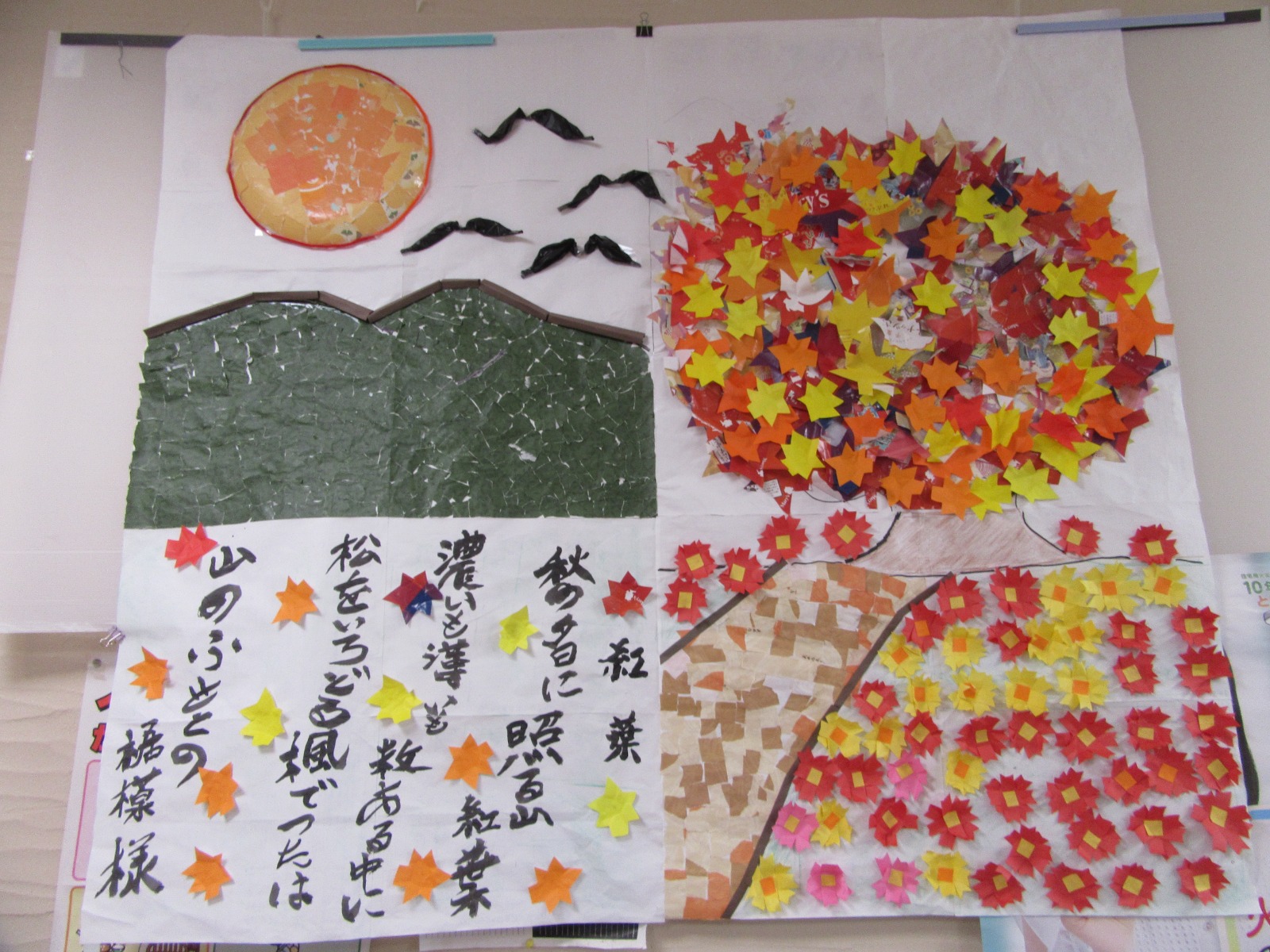 11月の壁画は、秋の風景に童謡の『紅葉』の歌詞を添えて表現しました。