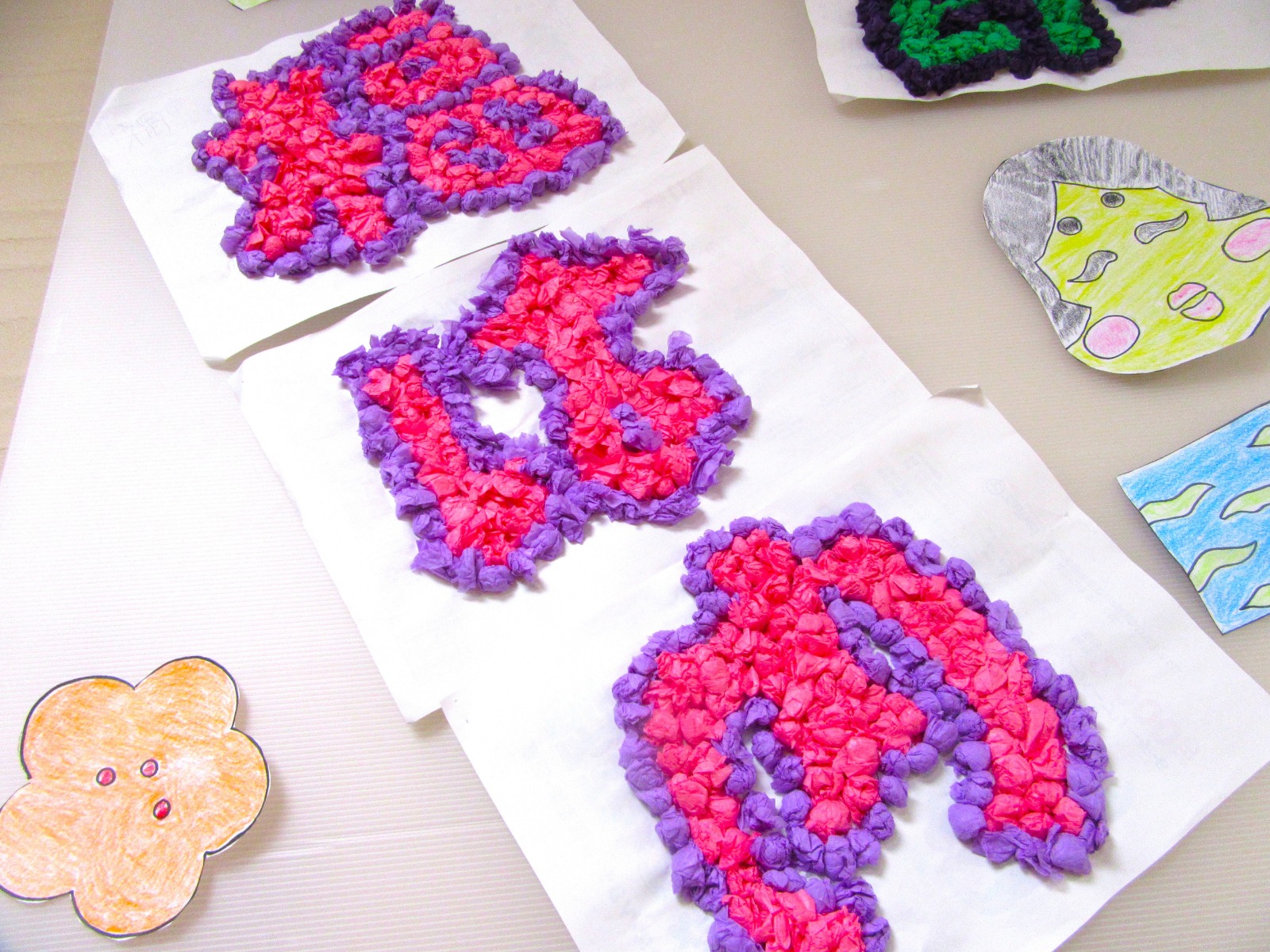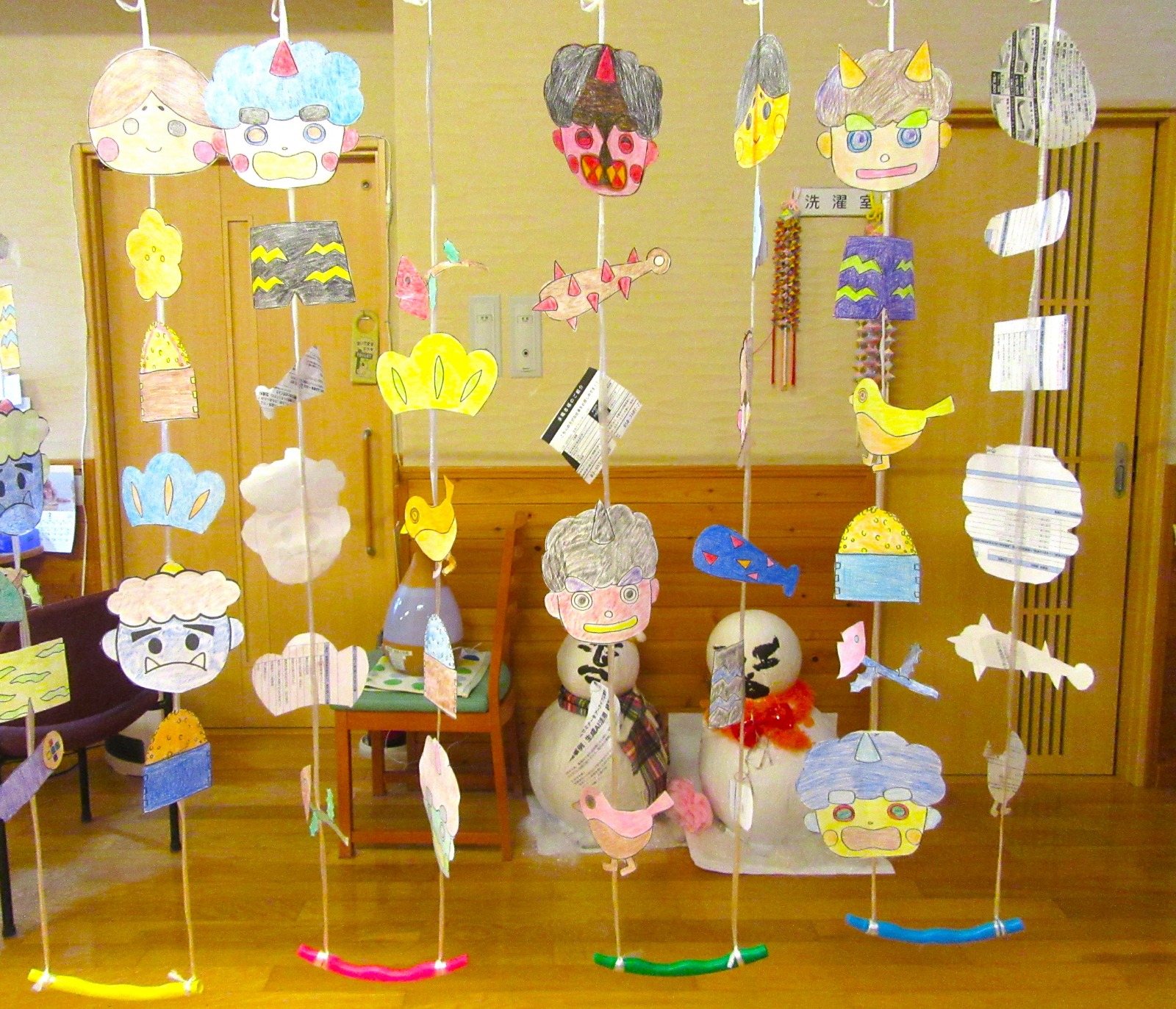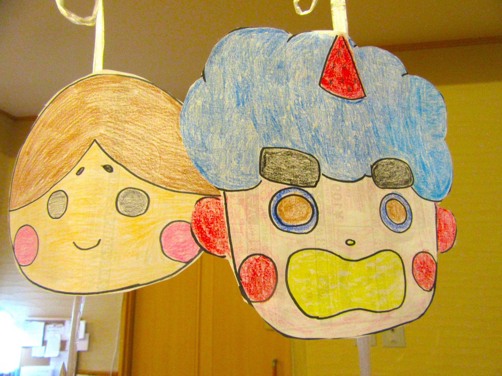 鬼の顔等を色塗りし切り取り、「鬼は外、福は内」の文字は千代紙を小さく丸めて貼り付けをしました😊
