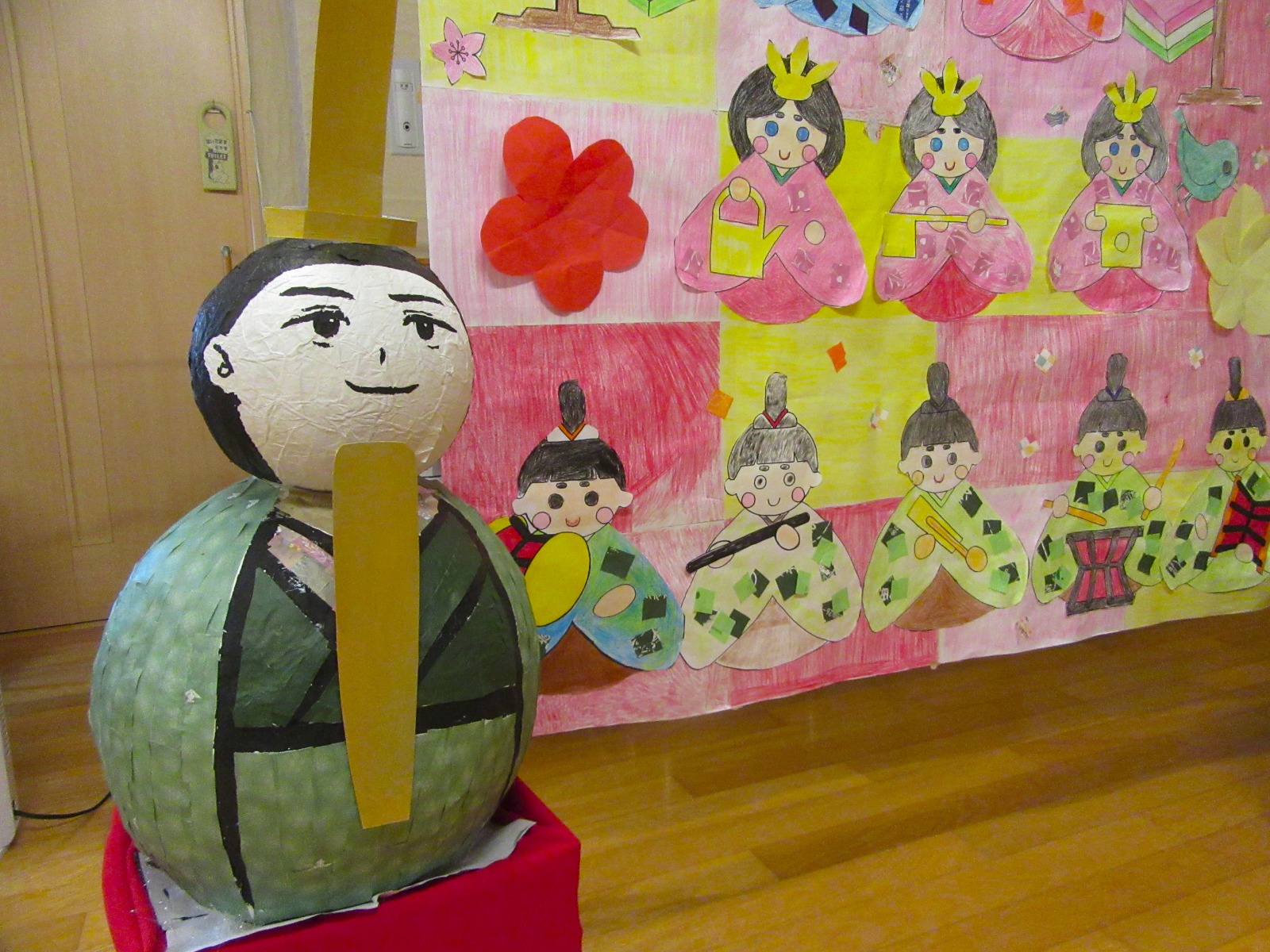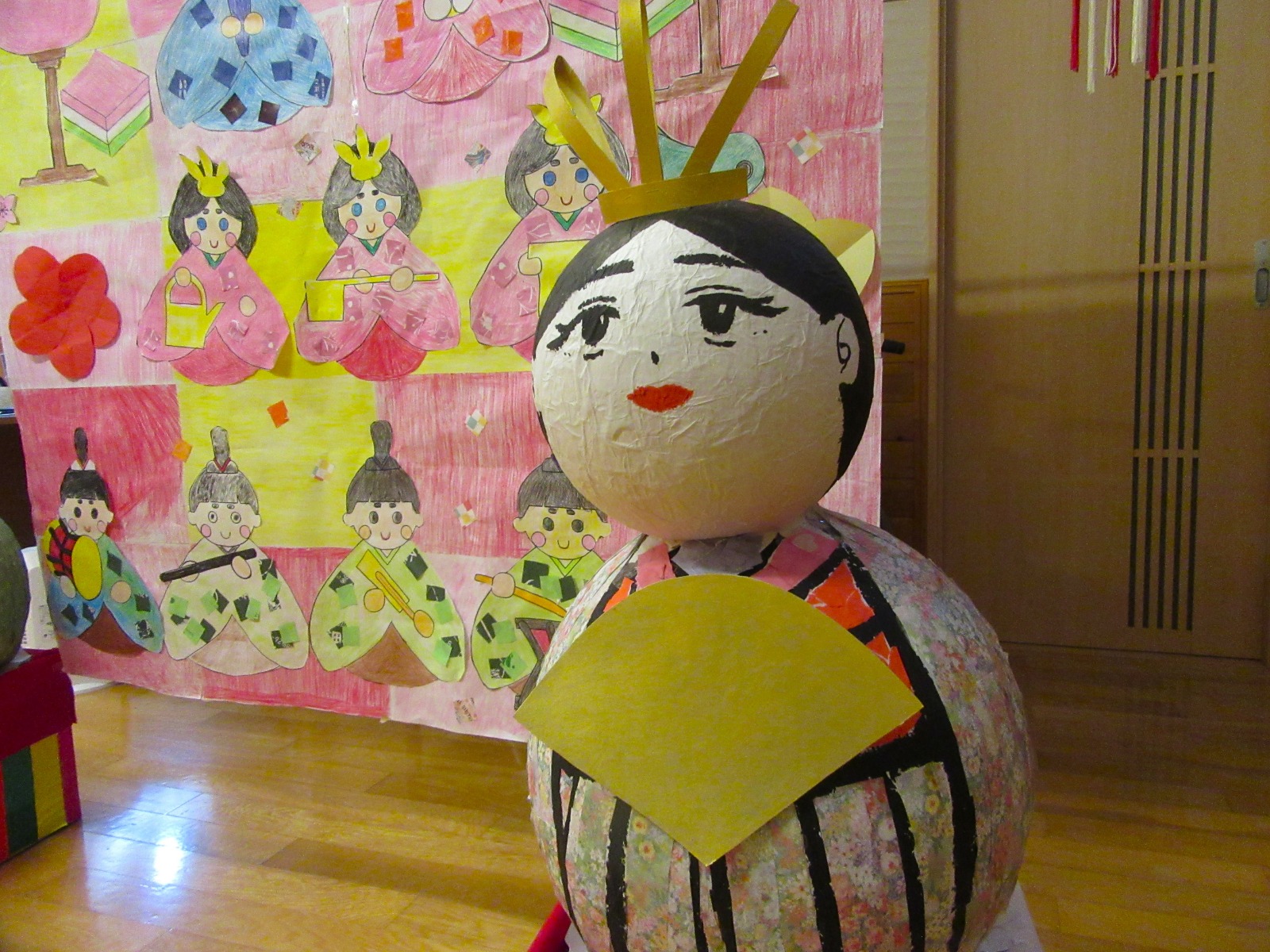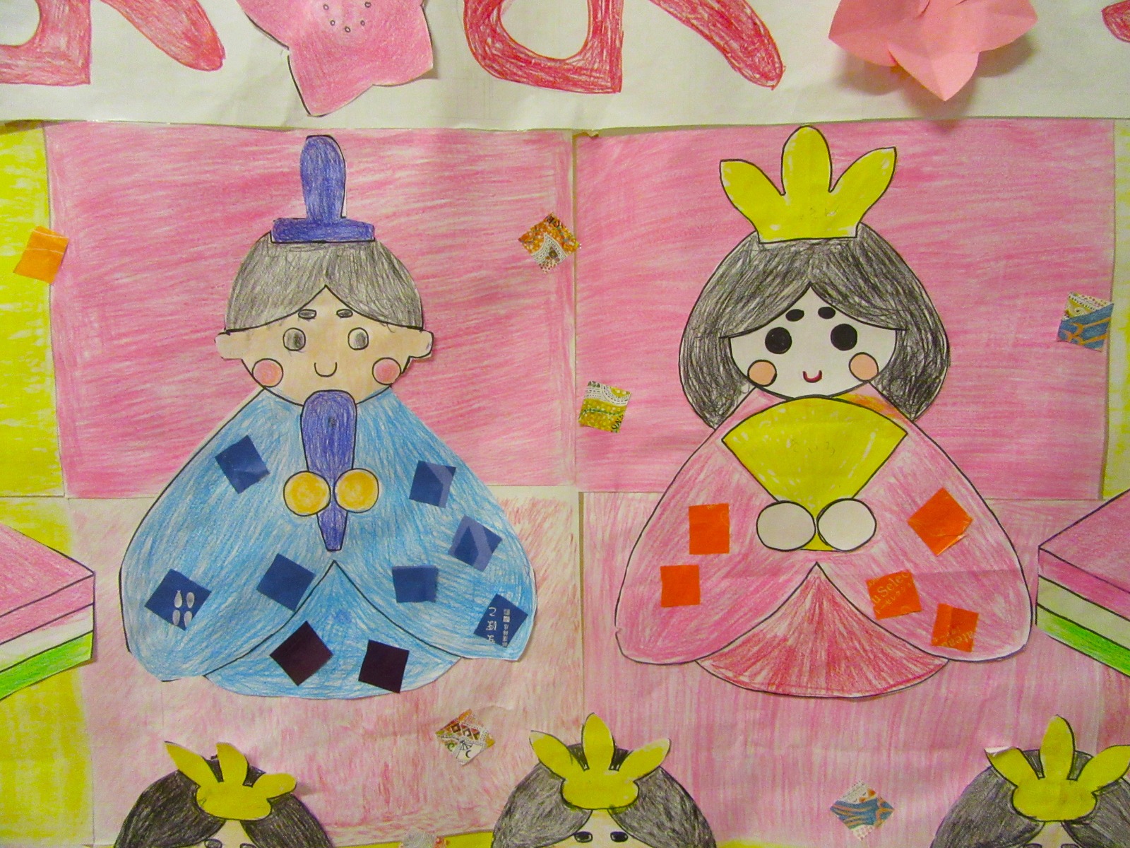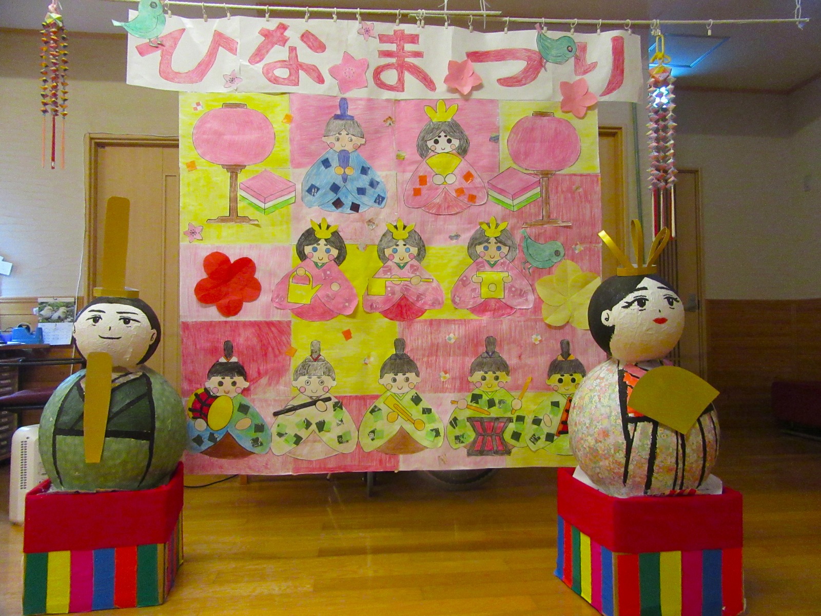 【ひな祭り🎎】3月の壁画は、ひな人形です🎎色染では力をこめて塗り仕上げました😊「上手にできたわね😊」と可愛らしい雛飾りが完成しました✨