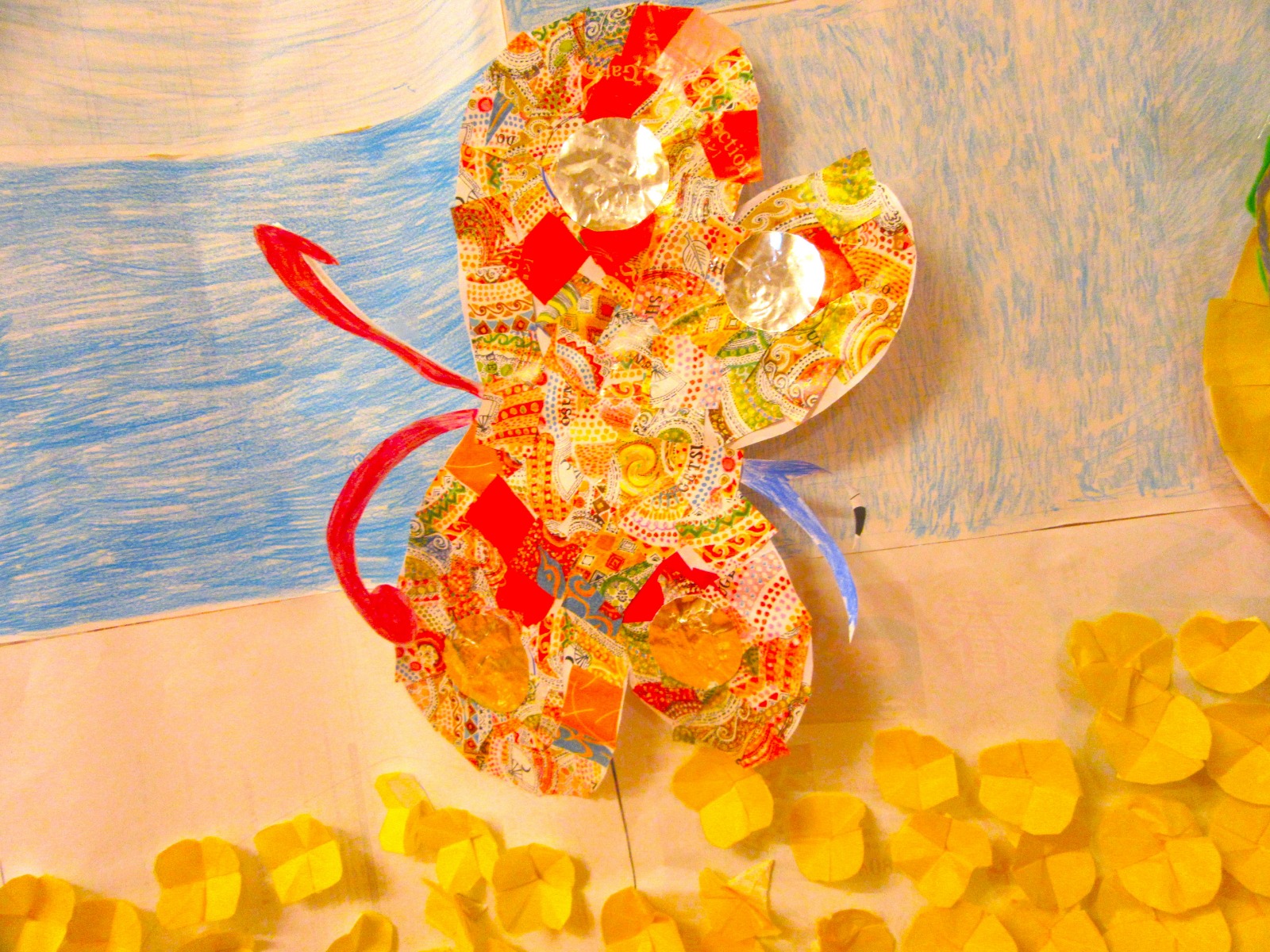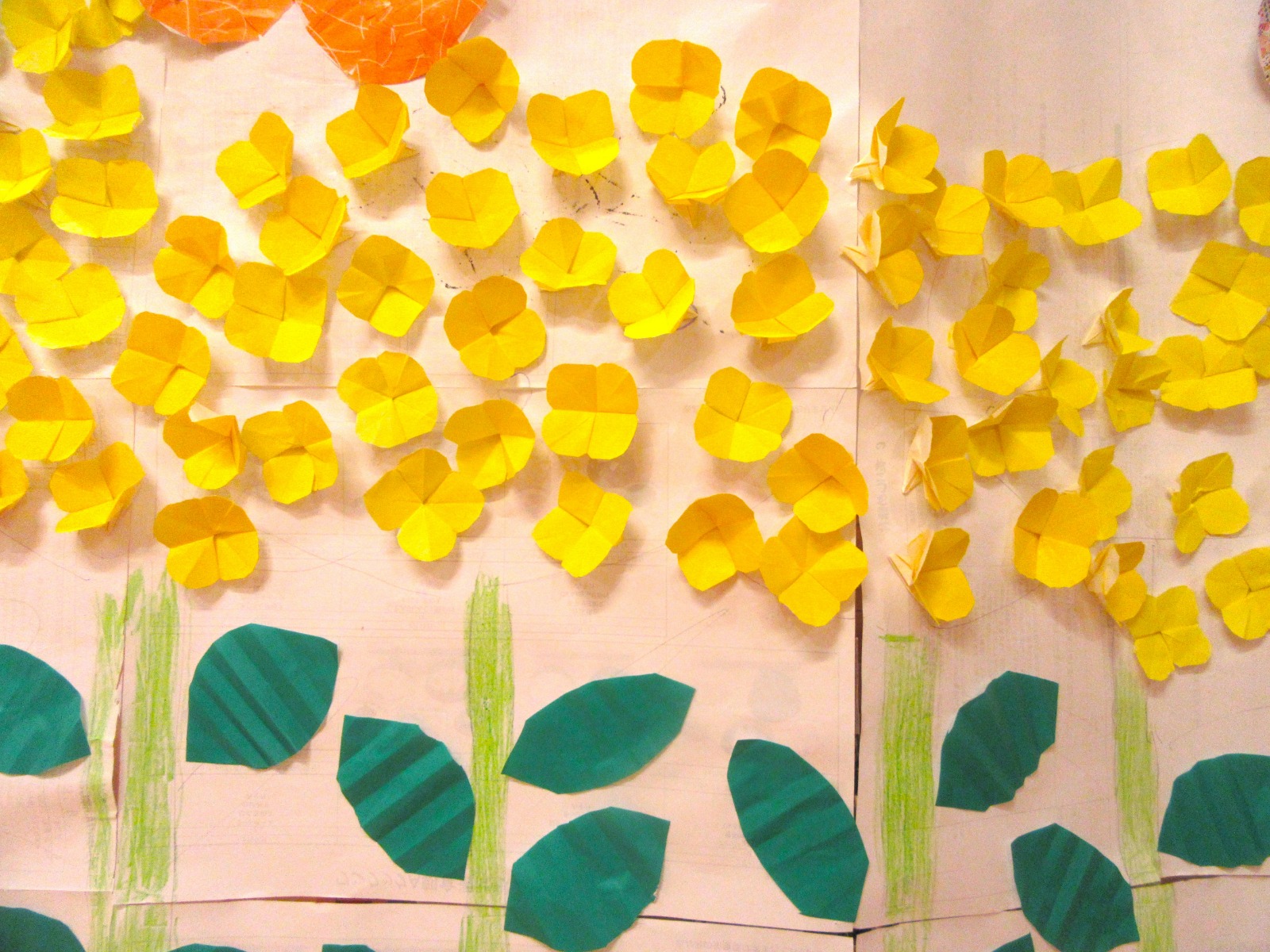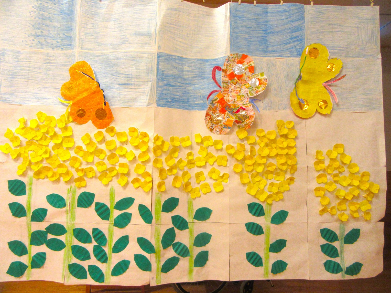 【菜の花畑🦋】4月の壁画は『菜の花畑と蝶々🦋』です。菜の花は折り紙で一つ一つ丁寧に折り、切って貼り付けました😊とても綺麗に仕上がりました✨